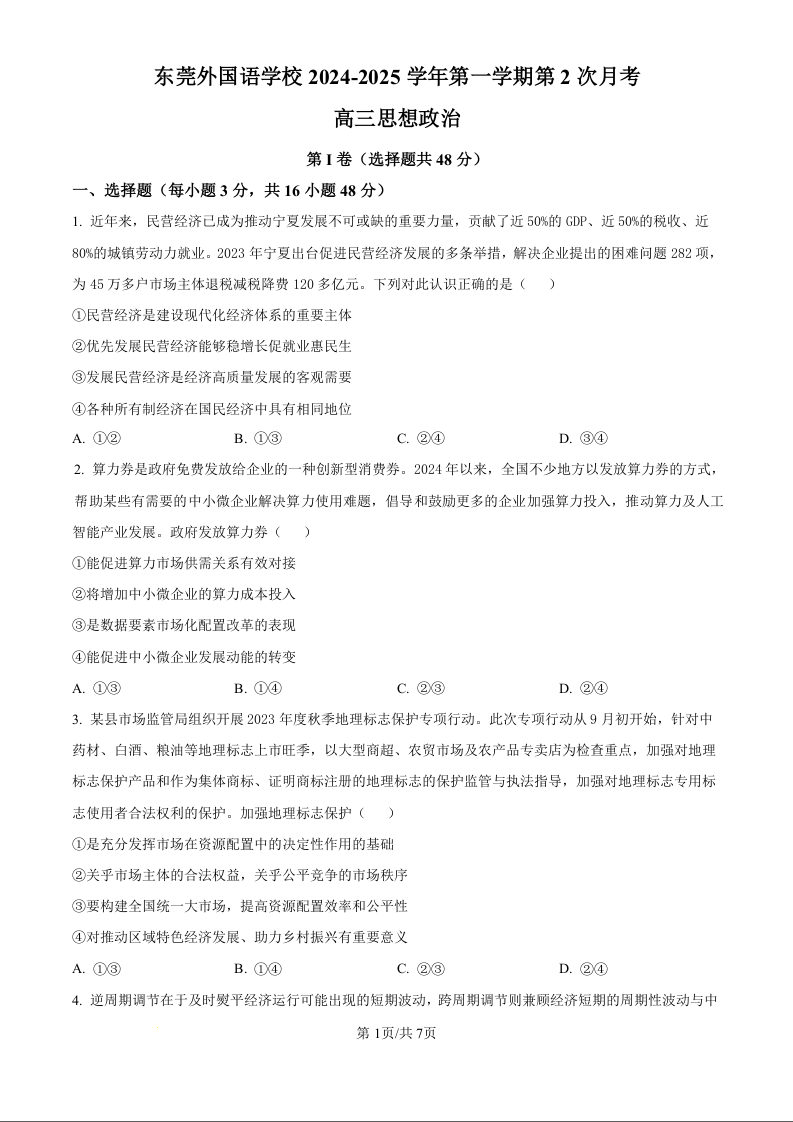 广东省东莞市东莞外国语学校2025届高三上学期10月月考 政治