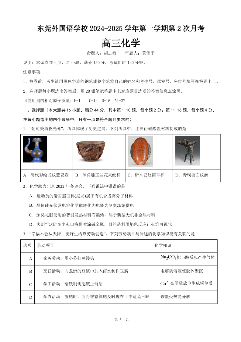 广东省东莞市东莞外国语学校2025届高三上学期10月月考 化学