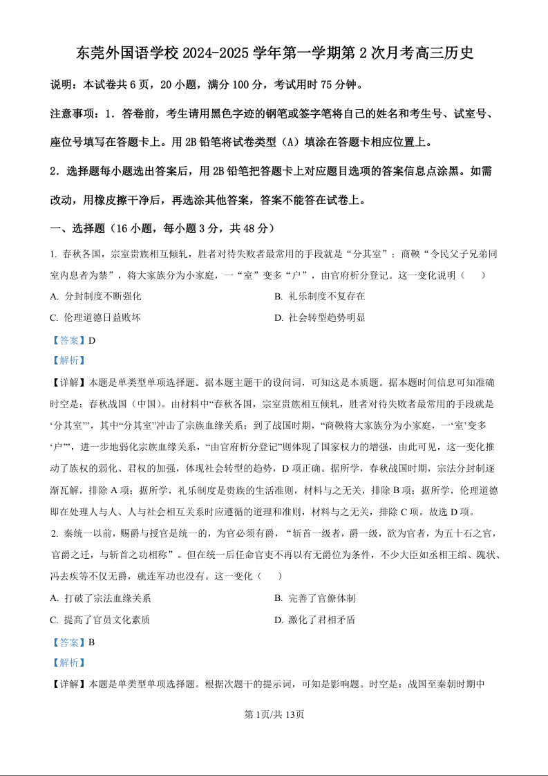 广东省东莞市东莞外国语学校2025届高三上学期10月月考 历史答案