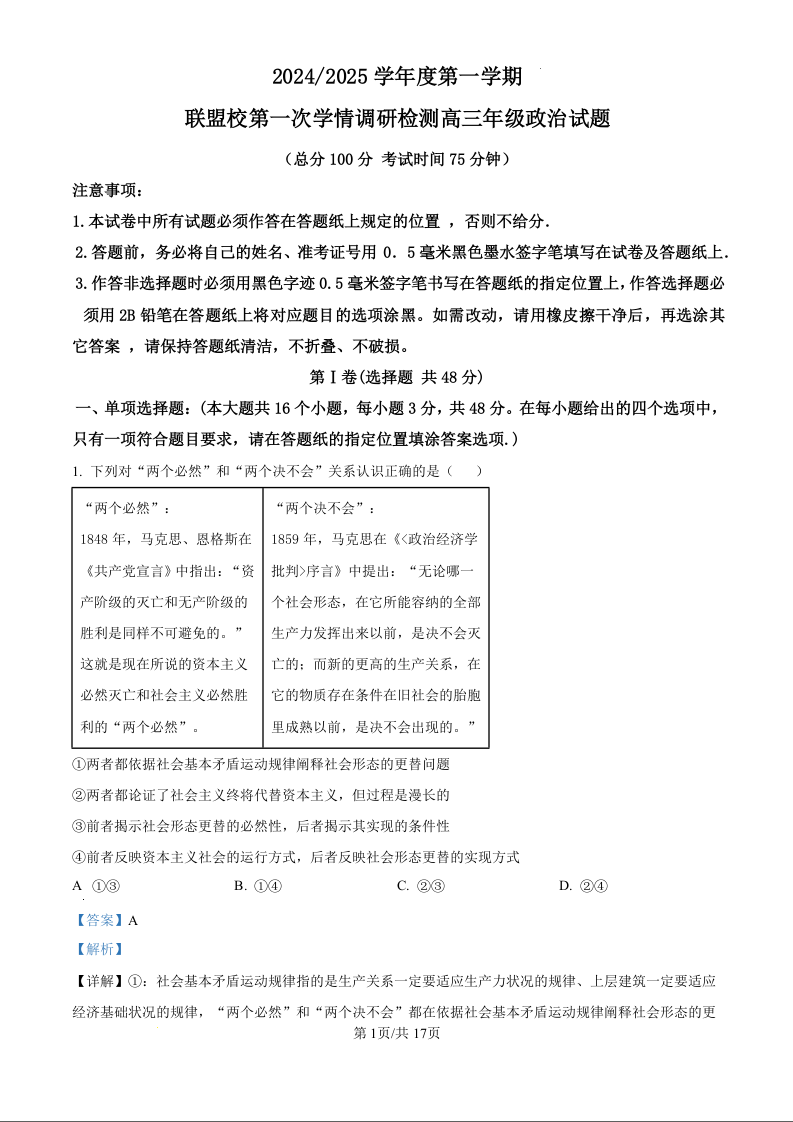 江苏省盐城市五校联考2025届高三上学期10月月考 政治答案