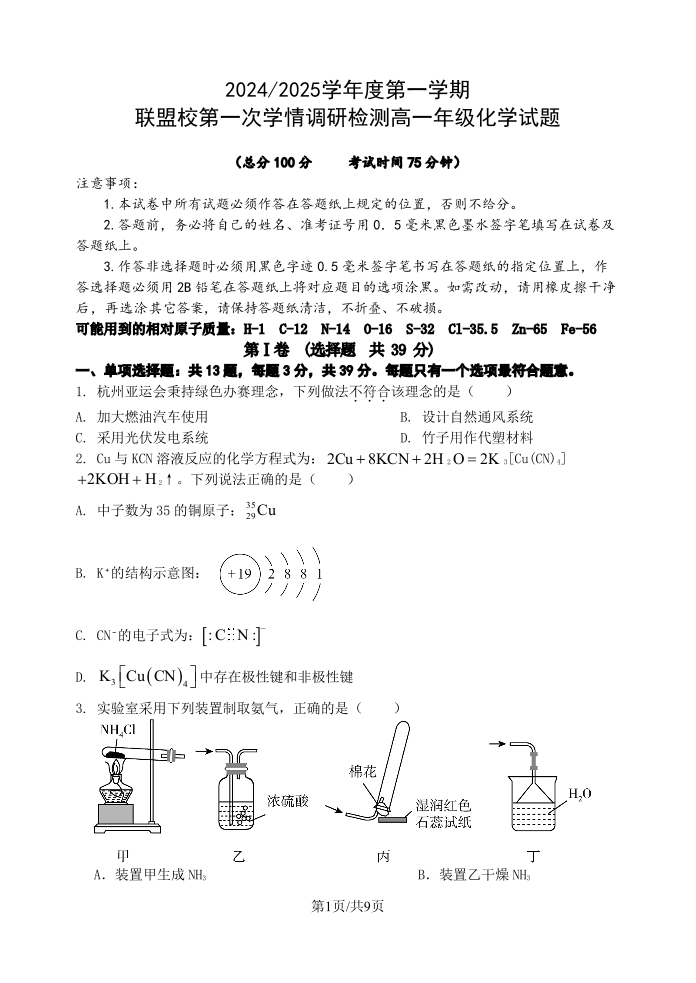 江苏省盐城市五校联考2025届高三上学期10月月考 化学