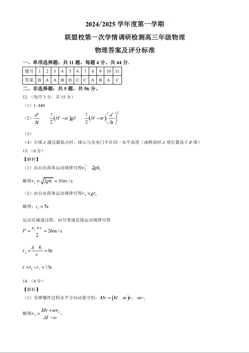 江苏省盐城市五校联考2025届高三上学期10月月考 物理答案