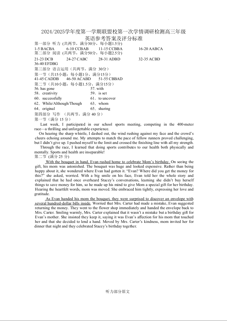 江苏省盐城市五校联考2025届高三上学期10月月考 英语答案