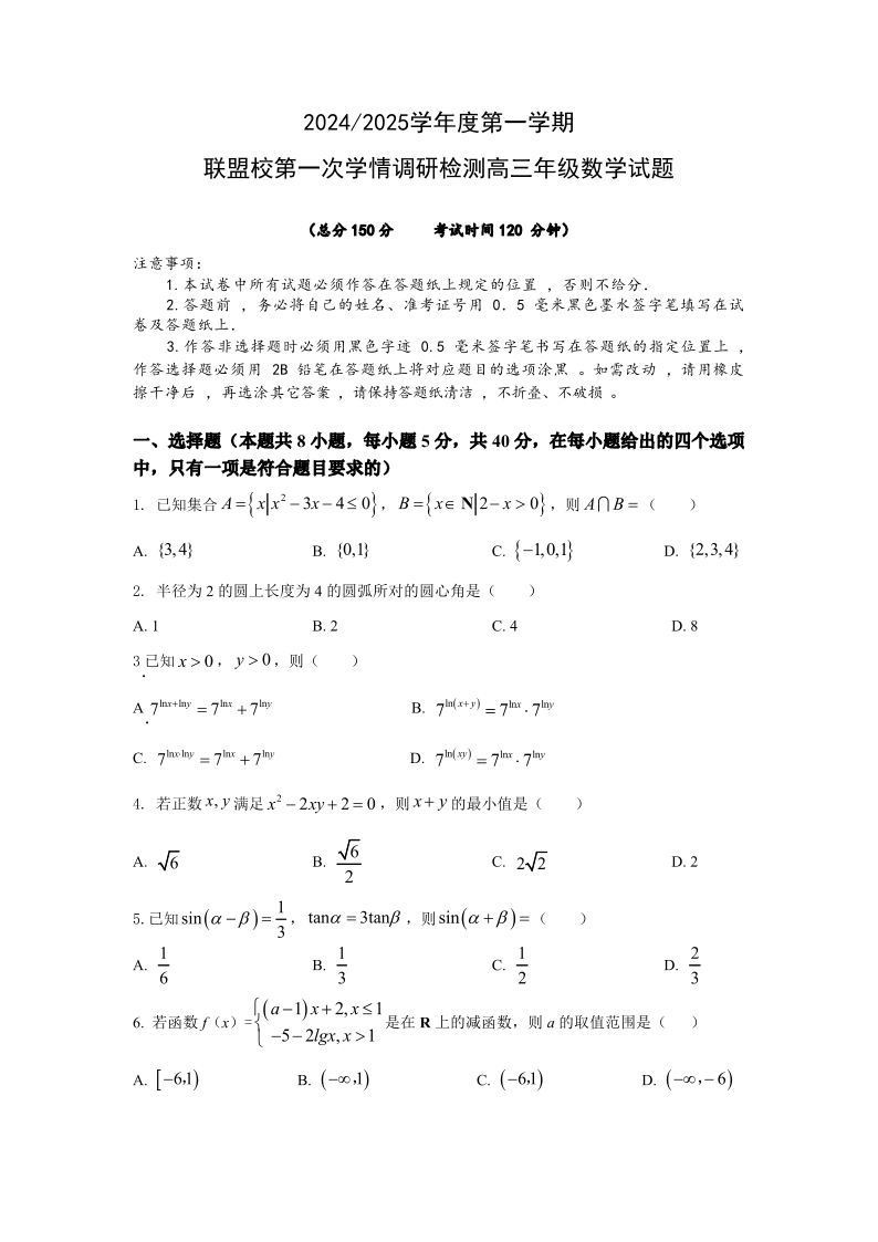 江苏省盐城市五校联考2025届高三上学期10月月考 数学