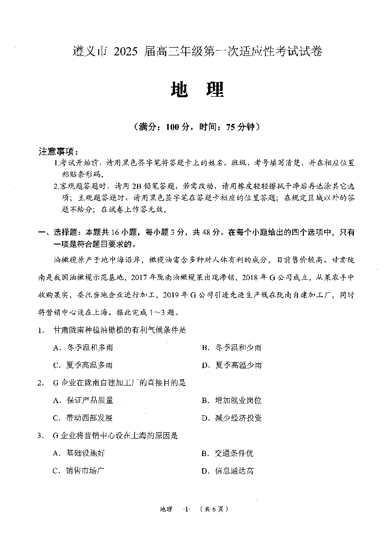 贵州省遵义市2025届高三年级第一次适应性考试 地理