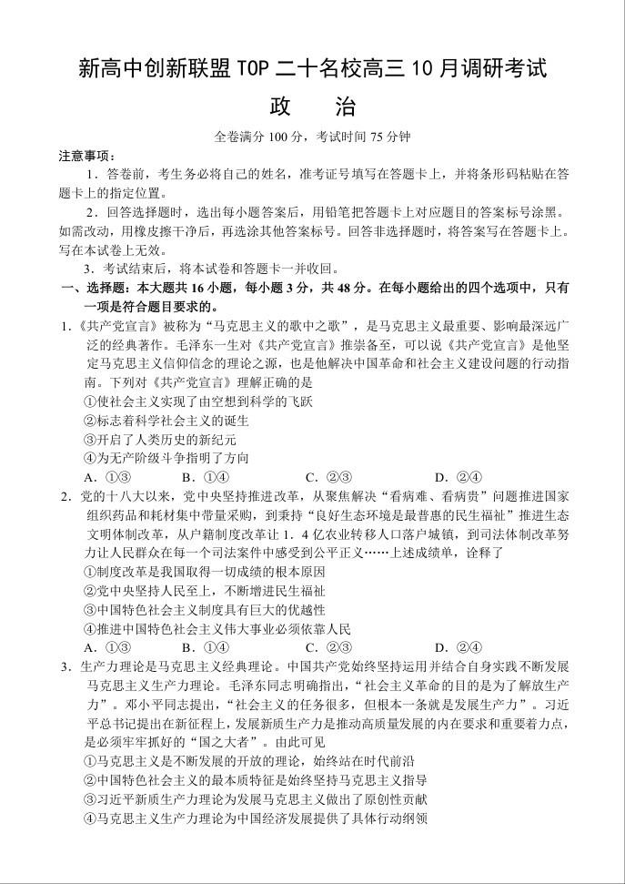 河南新高中创新联盟TOP二十名校2025届高三10月调研考试 政治
