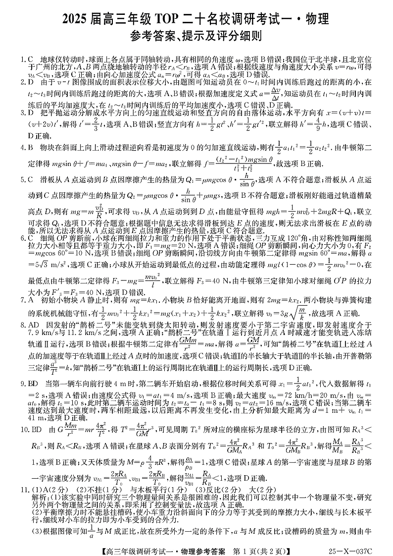 河南新高中创新联盟TOP二十名校2025届高三10月调研考试 物理答案
