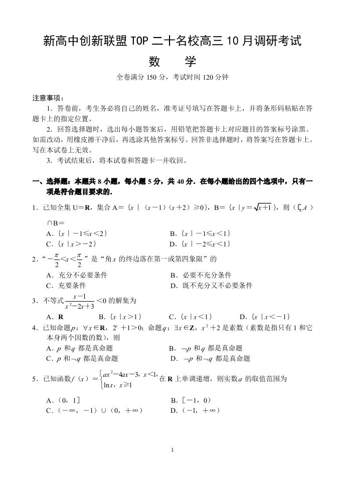 河南新高中创新联盟TOP二十名校2025届高三10月调研考试 数学