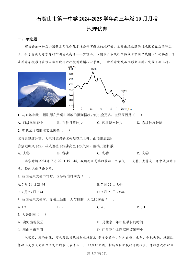 宁夏回族自治区石嘴山市第一中学2025届高三上学期10月月考 地理