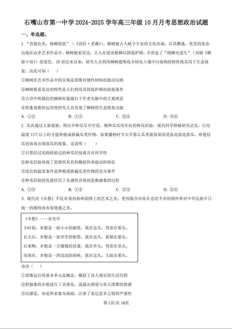 宁夏回族自治区石嘴山市第一中学2025届高三上学期10月月考 政治