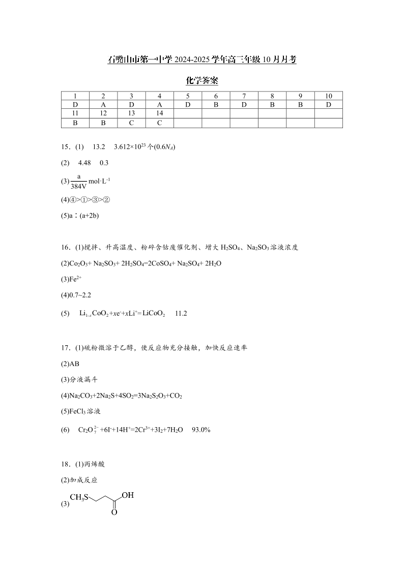 宁夏回族自治区石嘴山市第一中学2025届高三上学期10月月考 化学答案