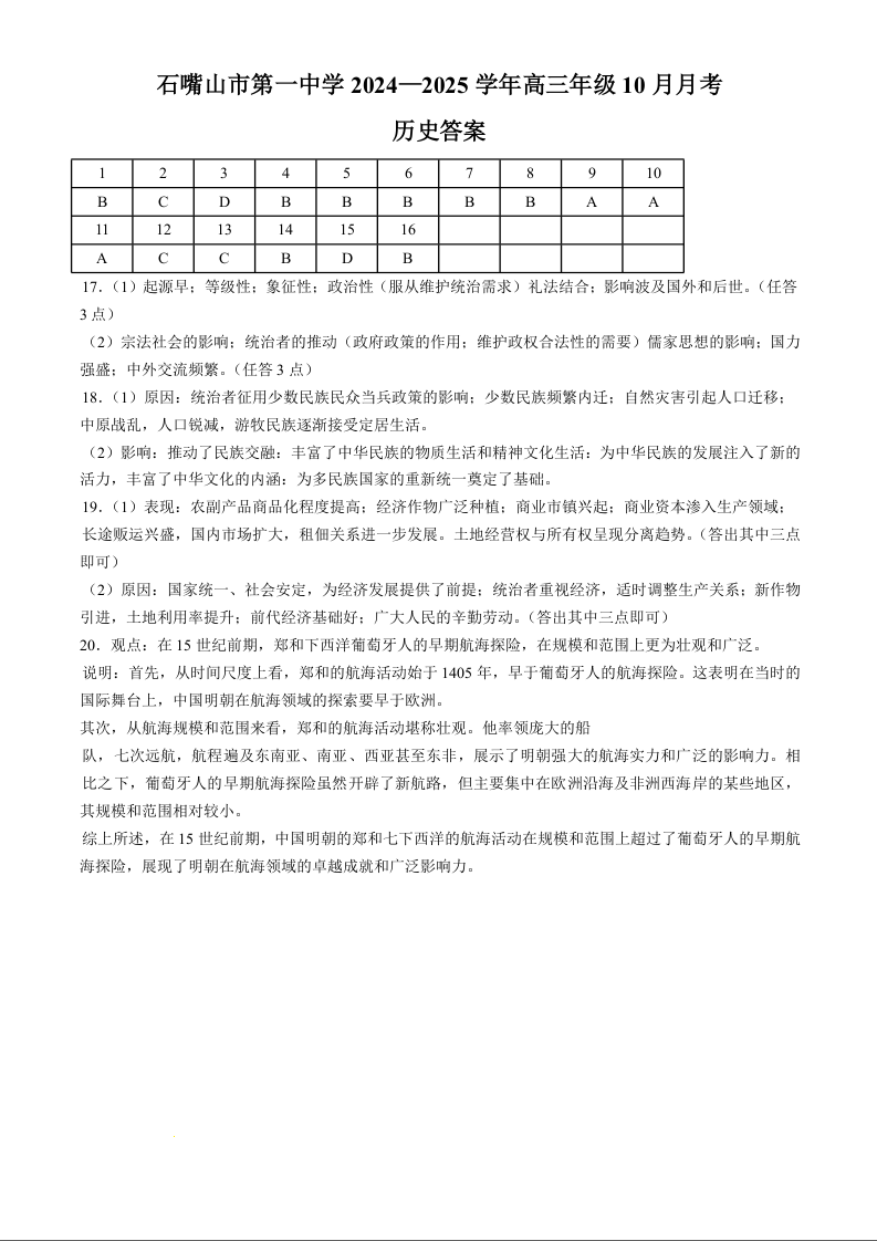 宁夏回族自治区石嘴山市第一中学2025届高三上学期10月月考 历史答案
