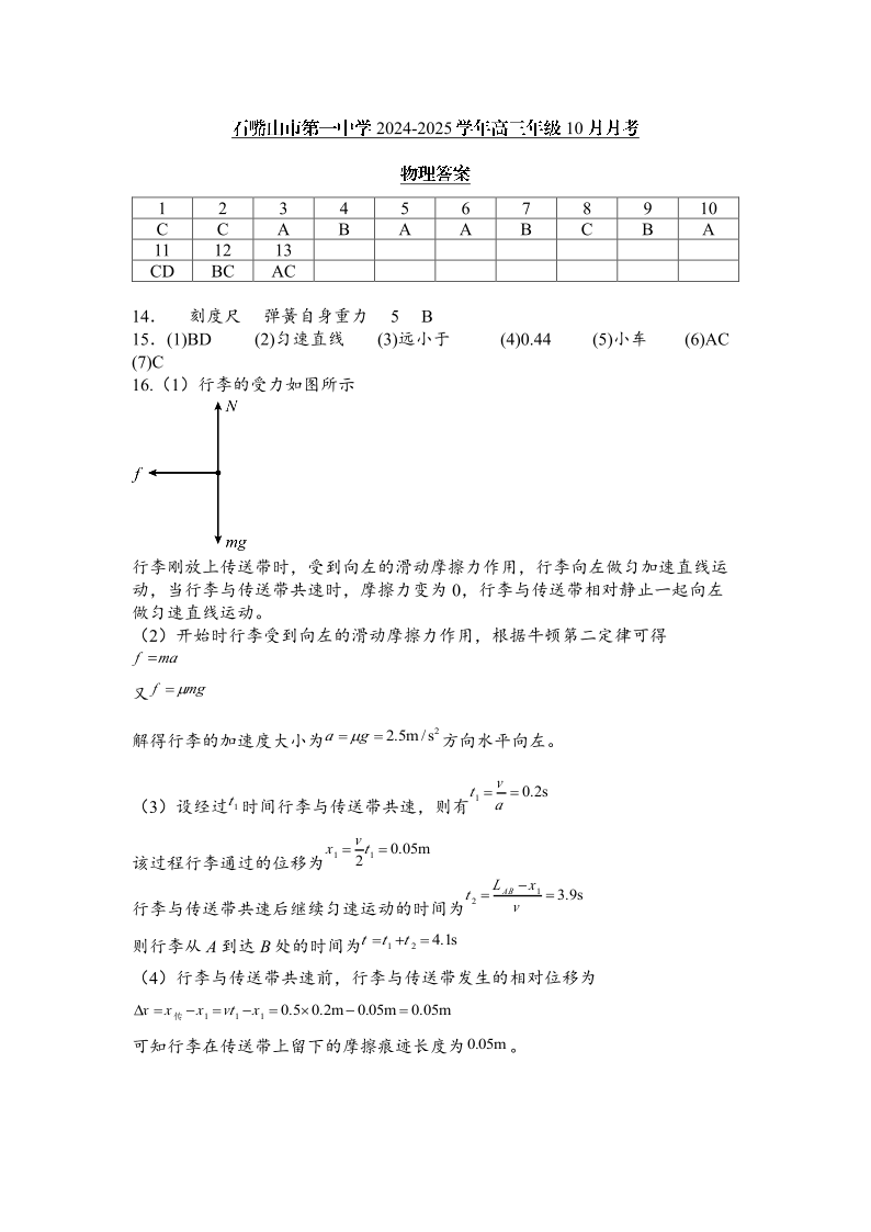 宁夏回族自治区石嘴山市第一中学2025届高三上学期10月月考 物理答案
