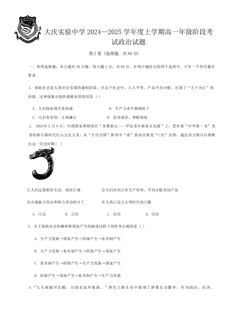 黑龙江省大庆市实验中学2024-2025学年高一上学期10月阶段考试 政治