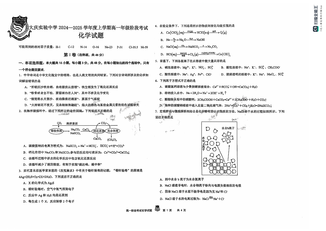 黑龙江省大庆市实验中学2024-2025学年高一上学期10月阶段考试 化学