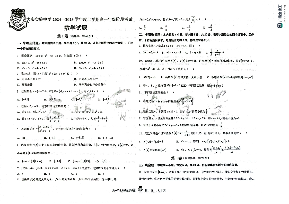 黑龙江省大庆市实验中学2024-2025学年高一上学期10月阶段考试 数学
