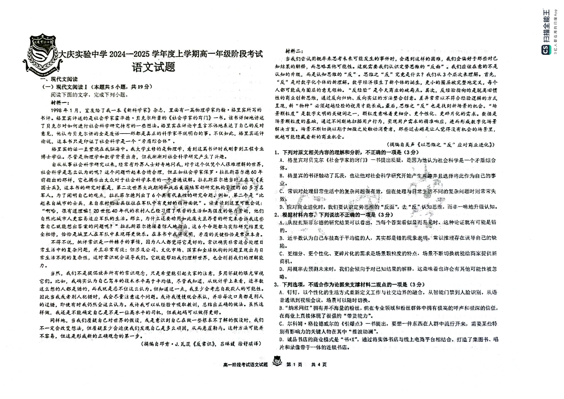 黑龙江省大庆市实验中学2024-2025学年高一上学期10月阶段考试 语文