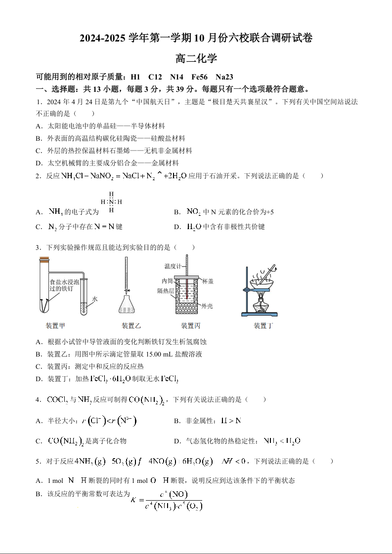 江苏省南京市六校联合体2024-2025学年高二上学期10月月考 化学