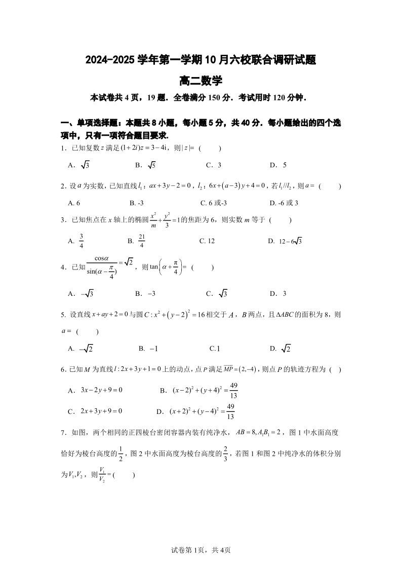 江苏省南京市六校联合体2024-2025学年高二上学期10月月考 数学