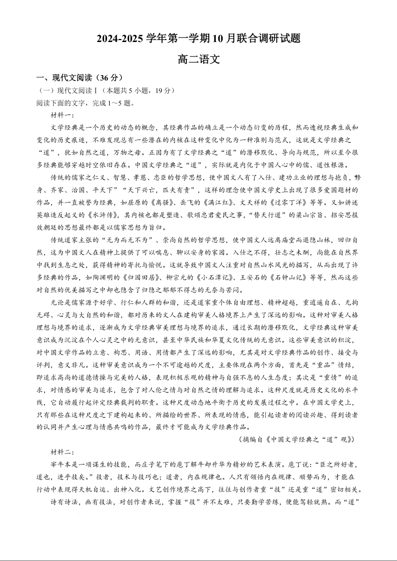 江苏省南京市六校联合体2024-2025学年高二上学期10月月考 语文