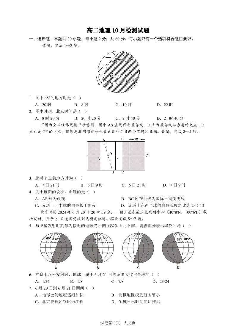 山东省济宁市邹城市第一中学2024-2025学年高二上学期10月月考 地理