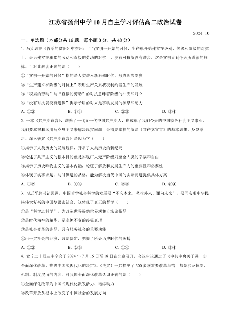 江苏省扬州中学2024-2025学年高二上学期10月月考 政治
