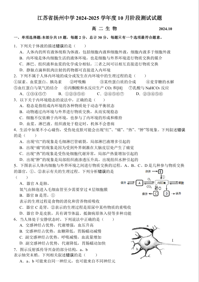 江苏省扬州中学2024-2025学年高二上学期10月月考 生物