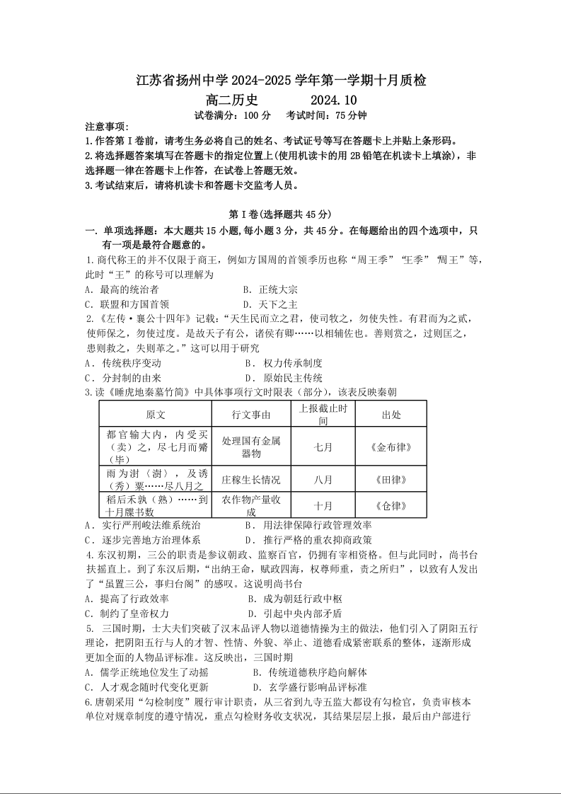 江苏省扬州中学2024-2025学年高二上学期10月月考 历史