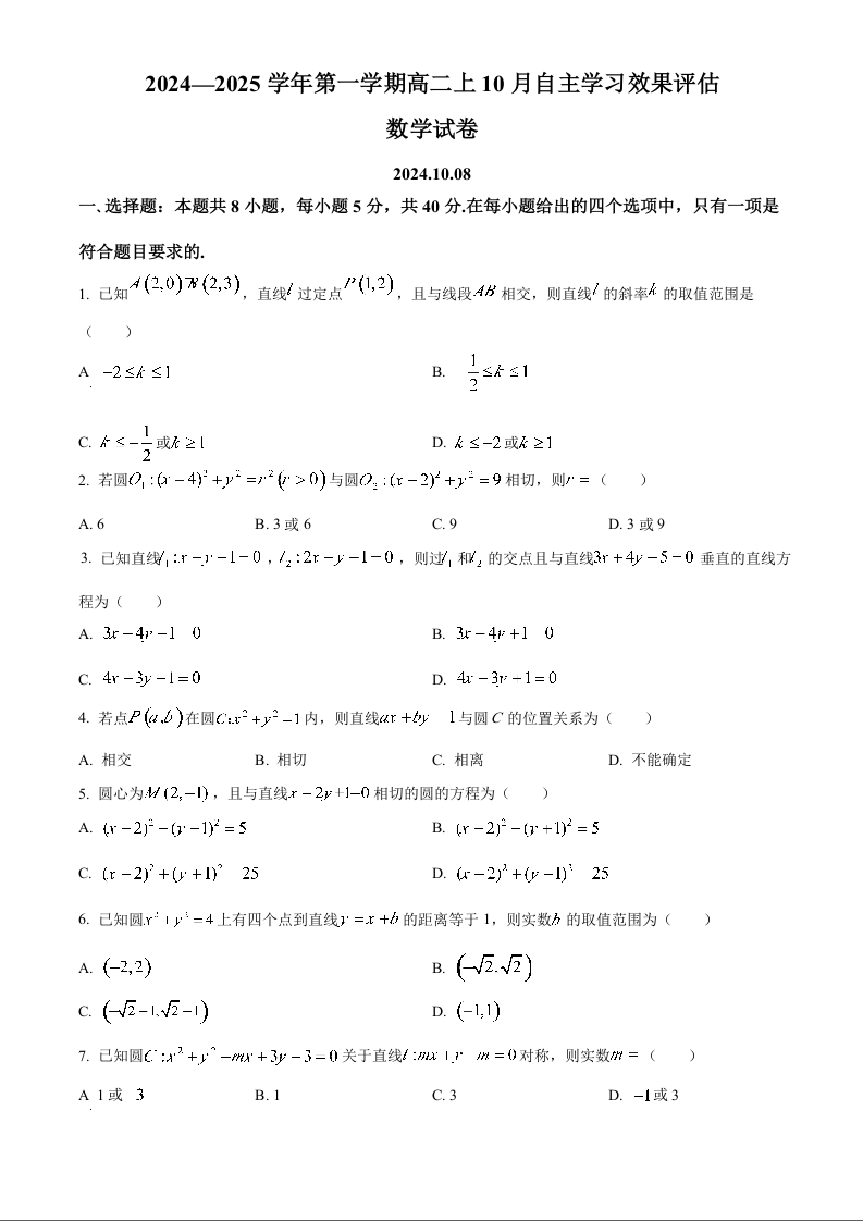 江苏省扬州中学2024-2025学年高二上学期10月月考 数学