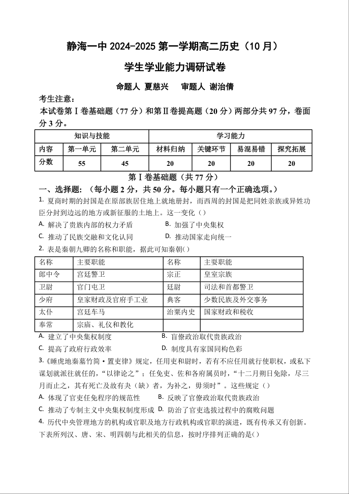 天津市静海区第一中学2024-2025学年高二上学期10月月考 历史