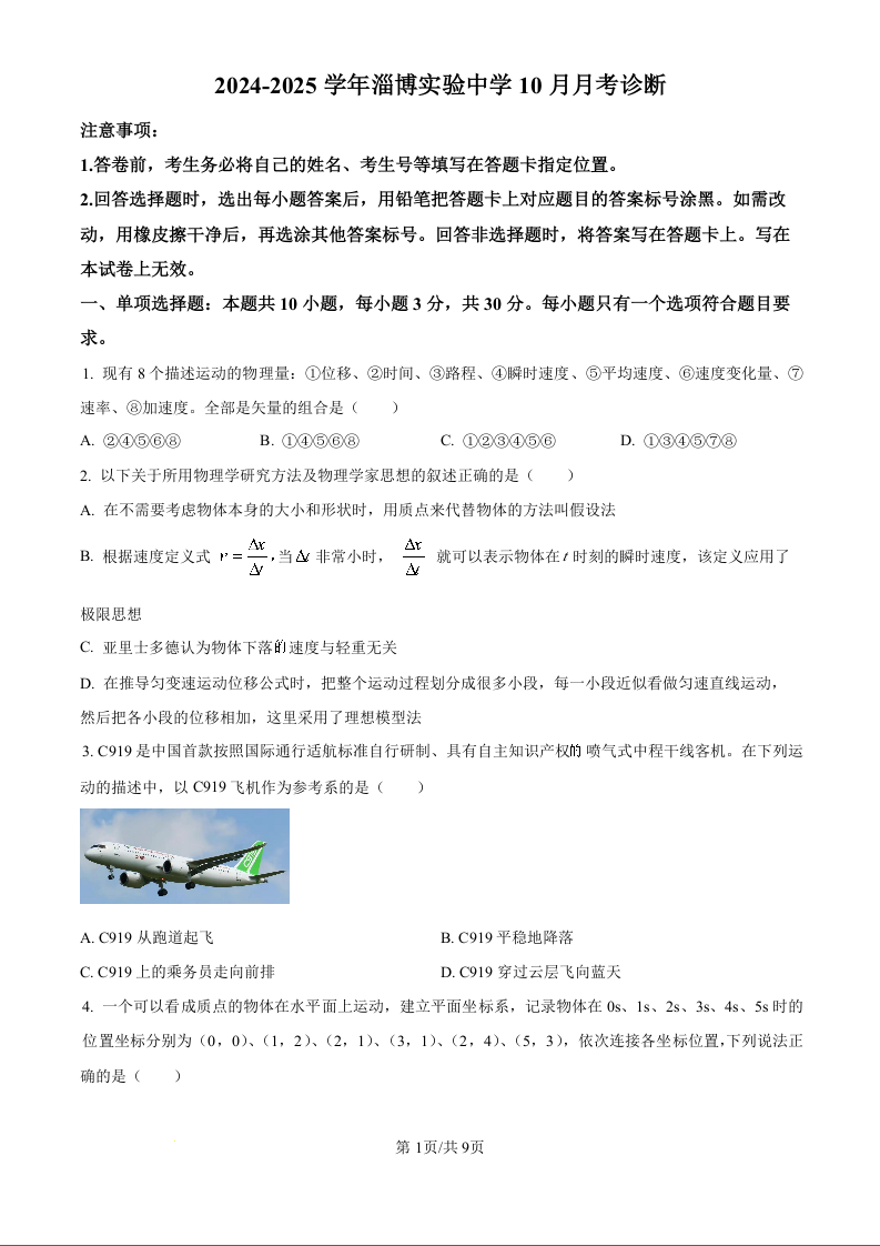 山东省淄博实验中学2024-2025学年高一上学期第一次教学诊断训练 物理