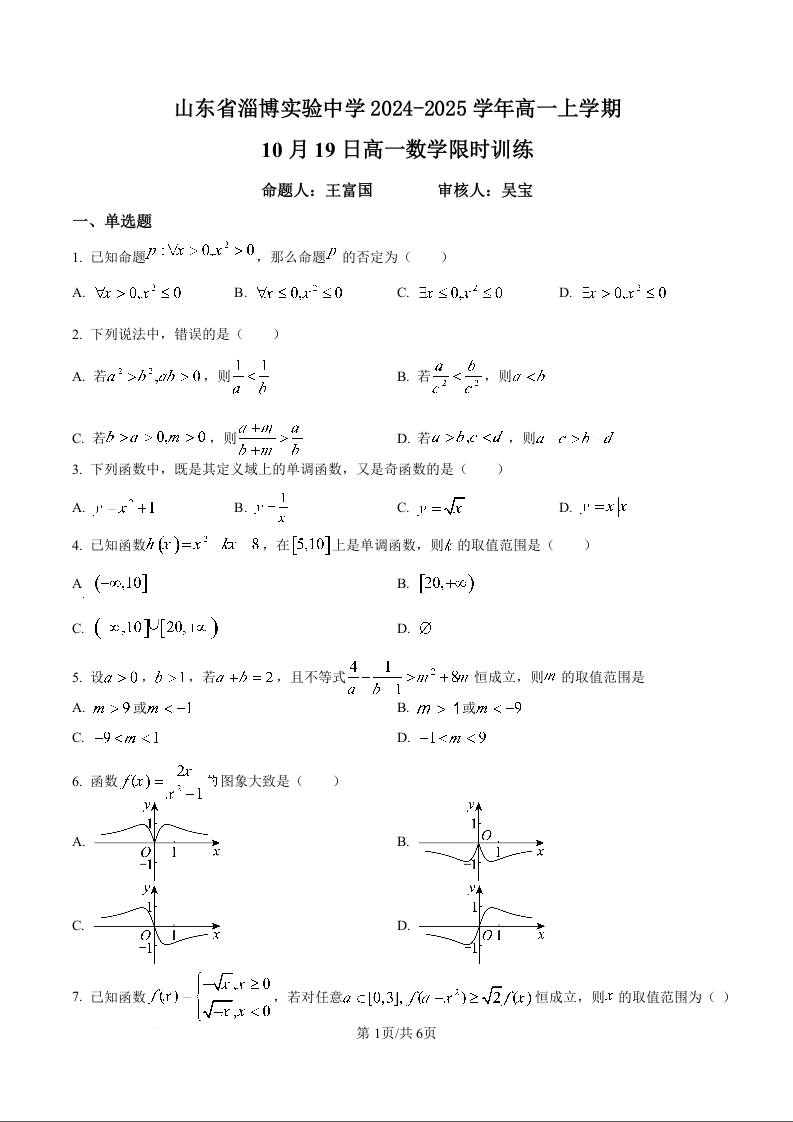 山东省淄博实验中学2024-2025学年高一上学期第一次教学诊断训练 数学