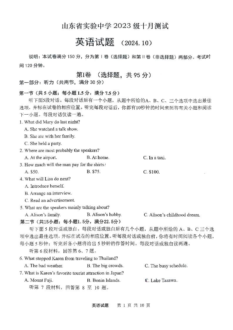 山东省实验中学2024-2025学年高二上学期10月月考 英语