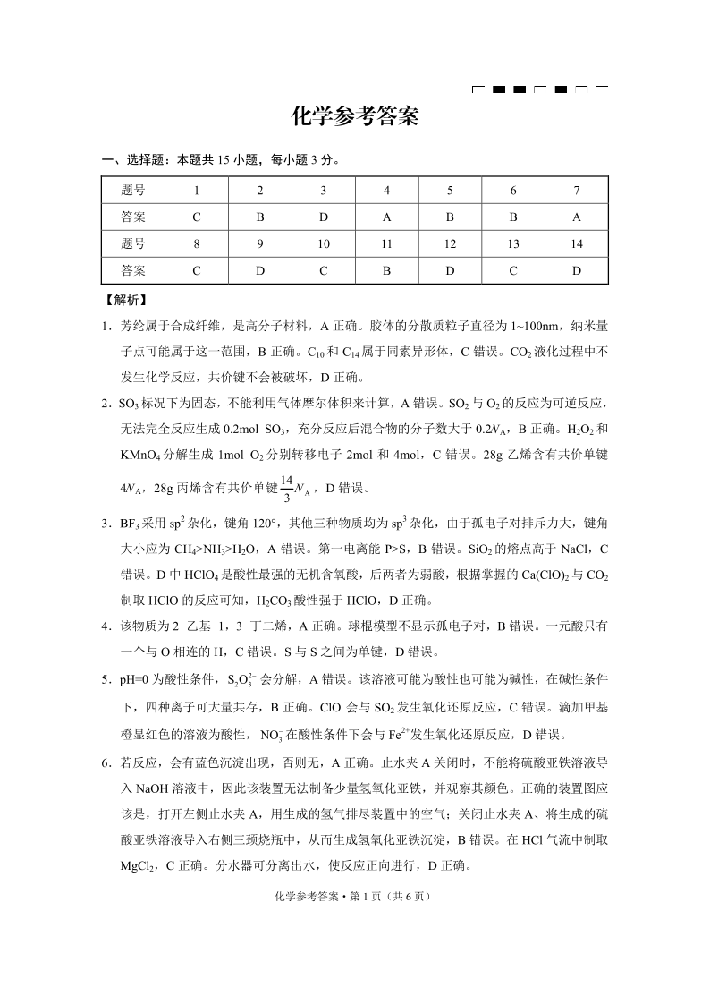 巴蜀中学2025届高考适应性月考卷(二)化学-答案