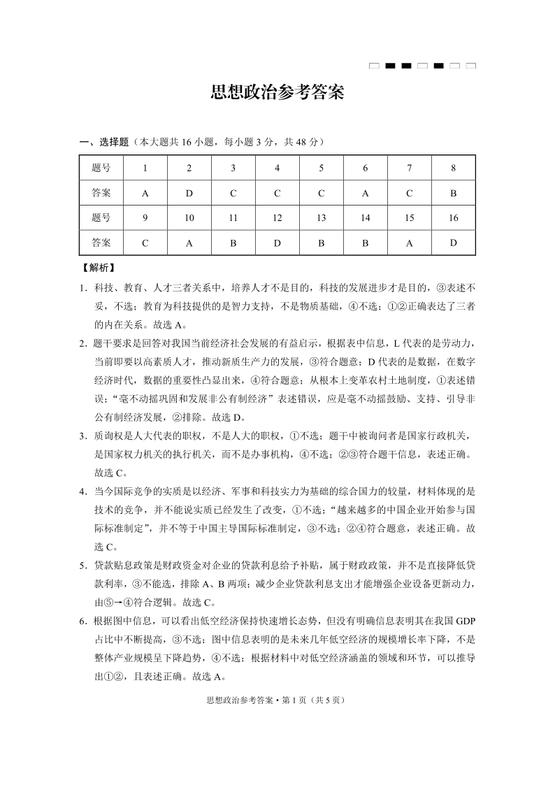 巴蜀中学2025届高考适应性月考卷(二)政治-答案