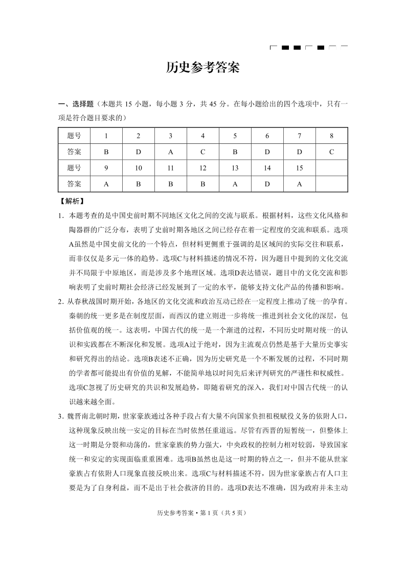 巴蜀中学2025届高考适应性月考卷(二)历史-答案