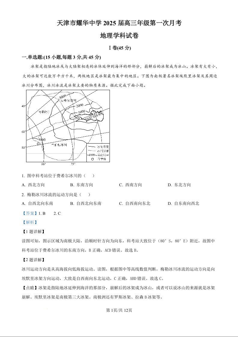 天津耀华中学2025届高三上期第一次月考 地理答案
