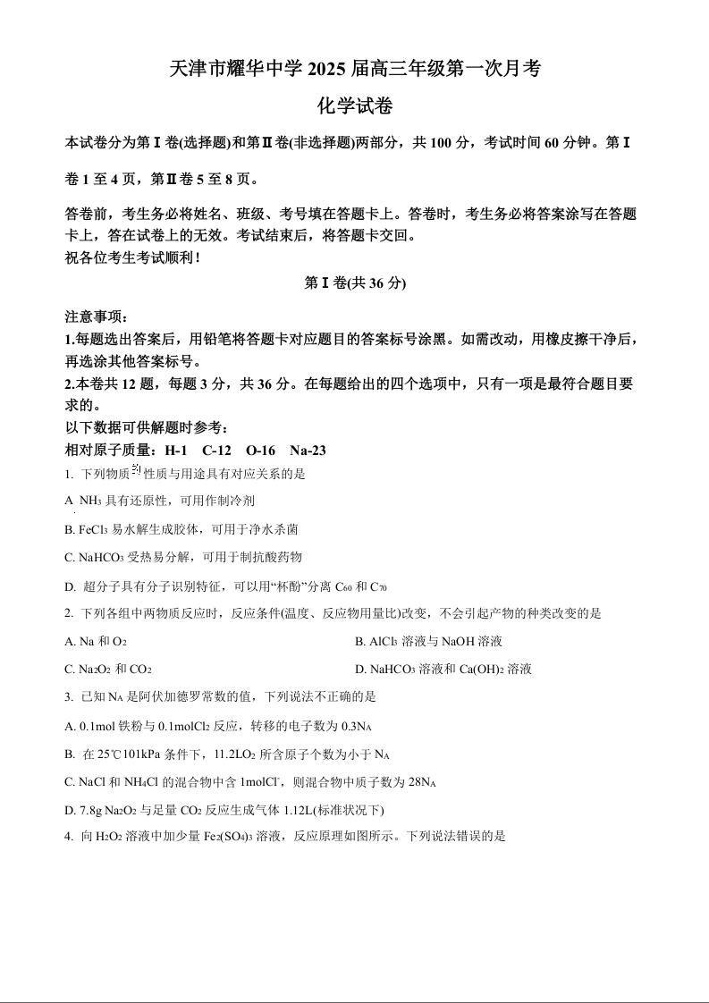 天津耀华中学2025届高三上期第一次月考 化学