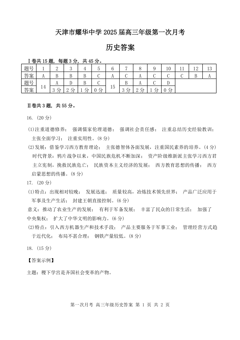天津耀华中学2025届高三上期第一次月考 历史答案