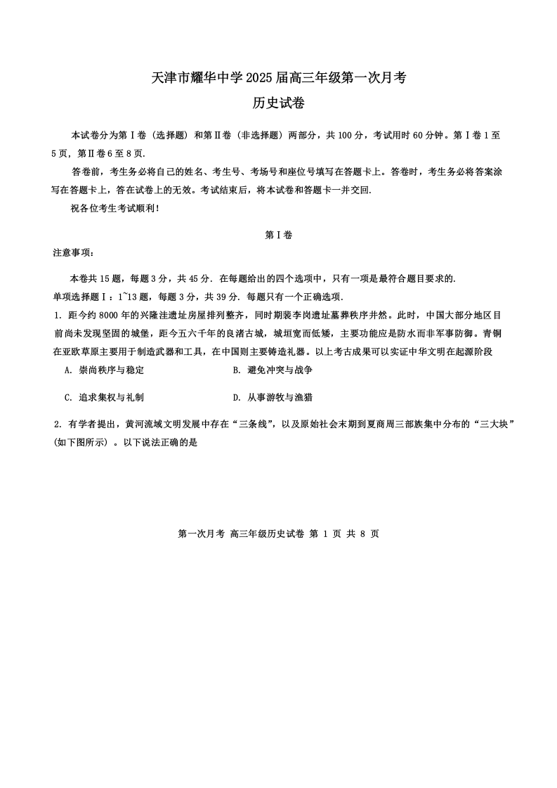 天津耀华中学2025届高三上期第一次月考 历史