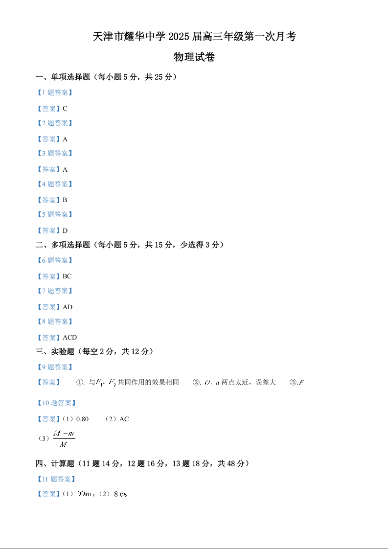 天津耀华中学2025届高三上期第一次月考 物理答案