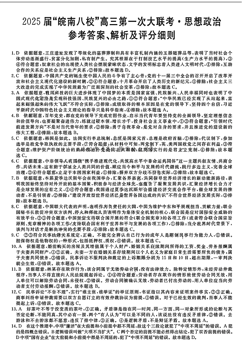 2025届“皖南八校”高三第一次大联考 政治答案