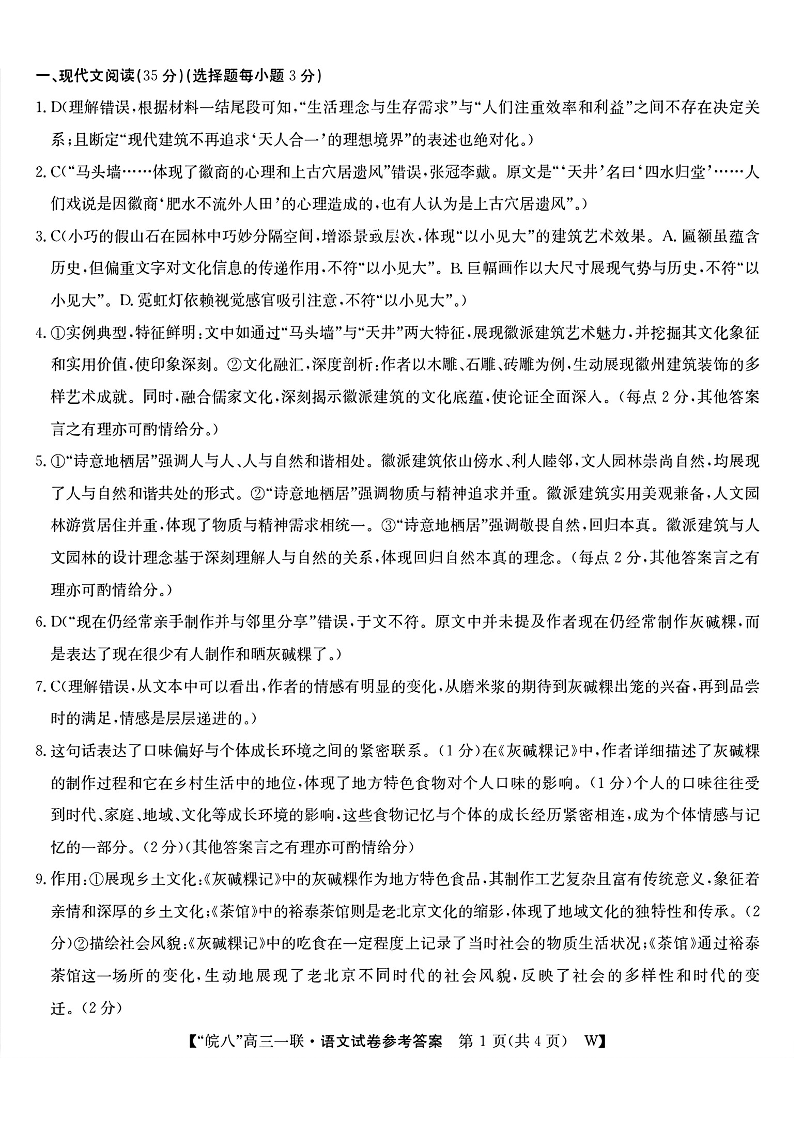 2025届“皖南八校”高三第一次大联考 语文答案