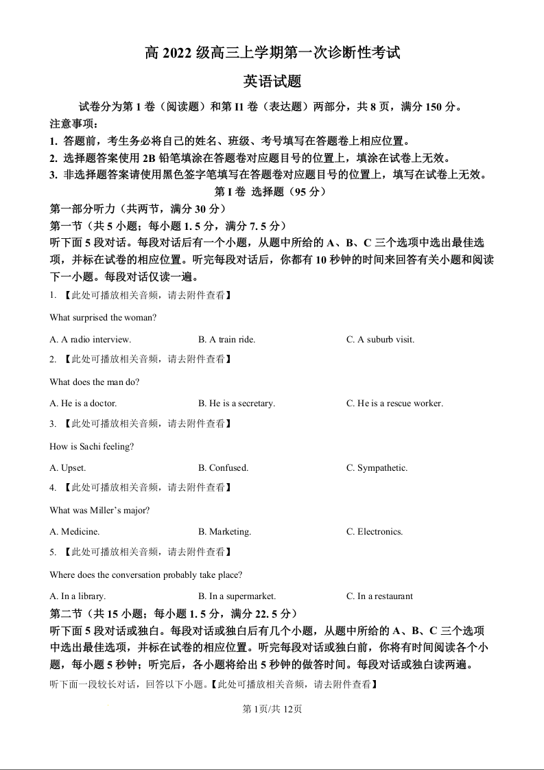 四川省宜宾市叙州区高2022级高三上期第一次诊断性考试 英语