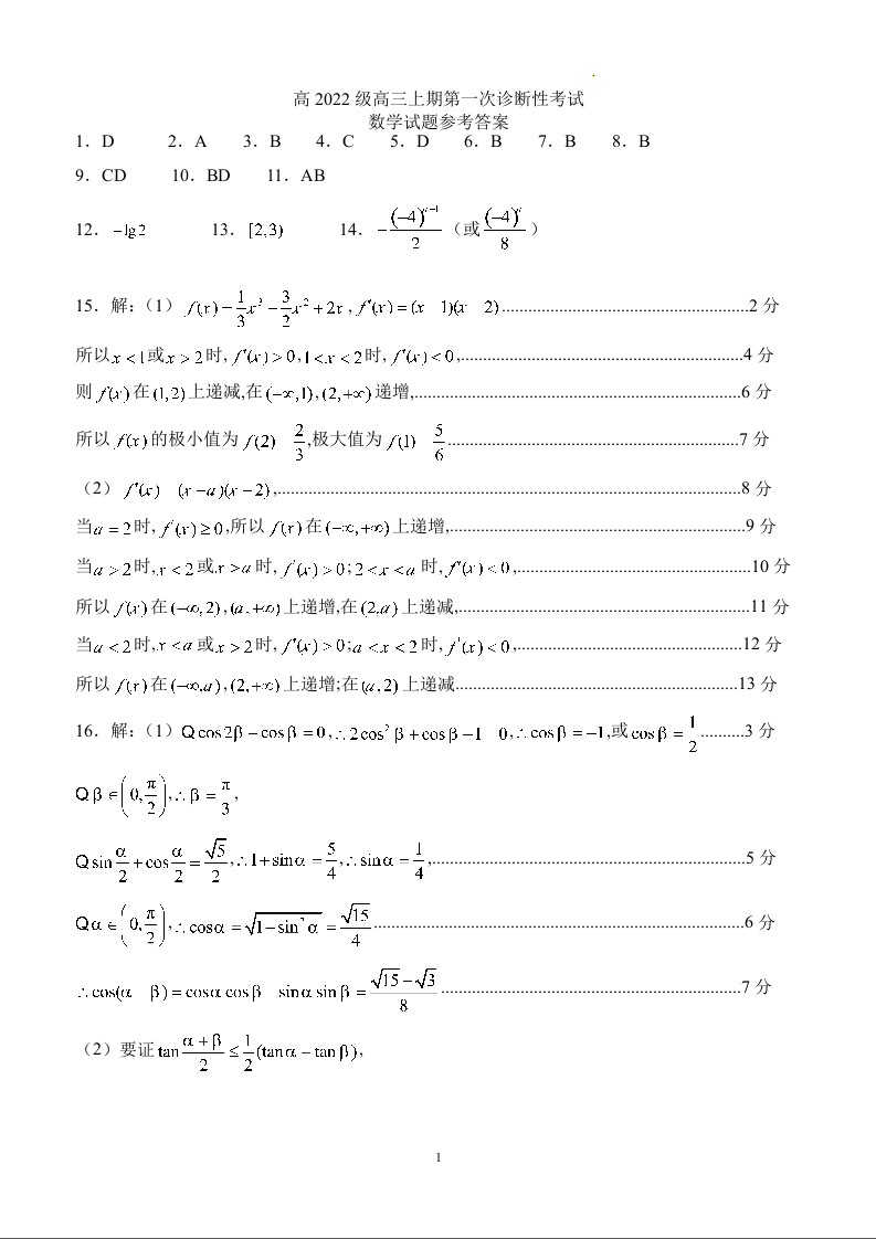 四川省宜宾市叙州区高2022级高三上期第一次诊断性考试 数学答案