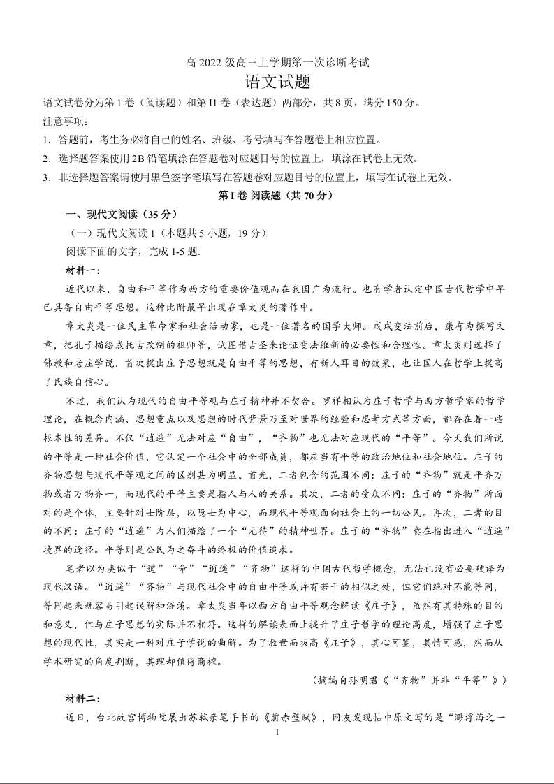 四川省宜宾市叙州区高2022级高三上期第一次诊断性考试 语文