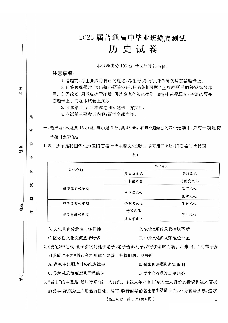 广西2025届高三10月七市联考 历史