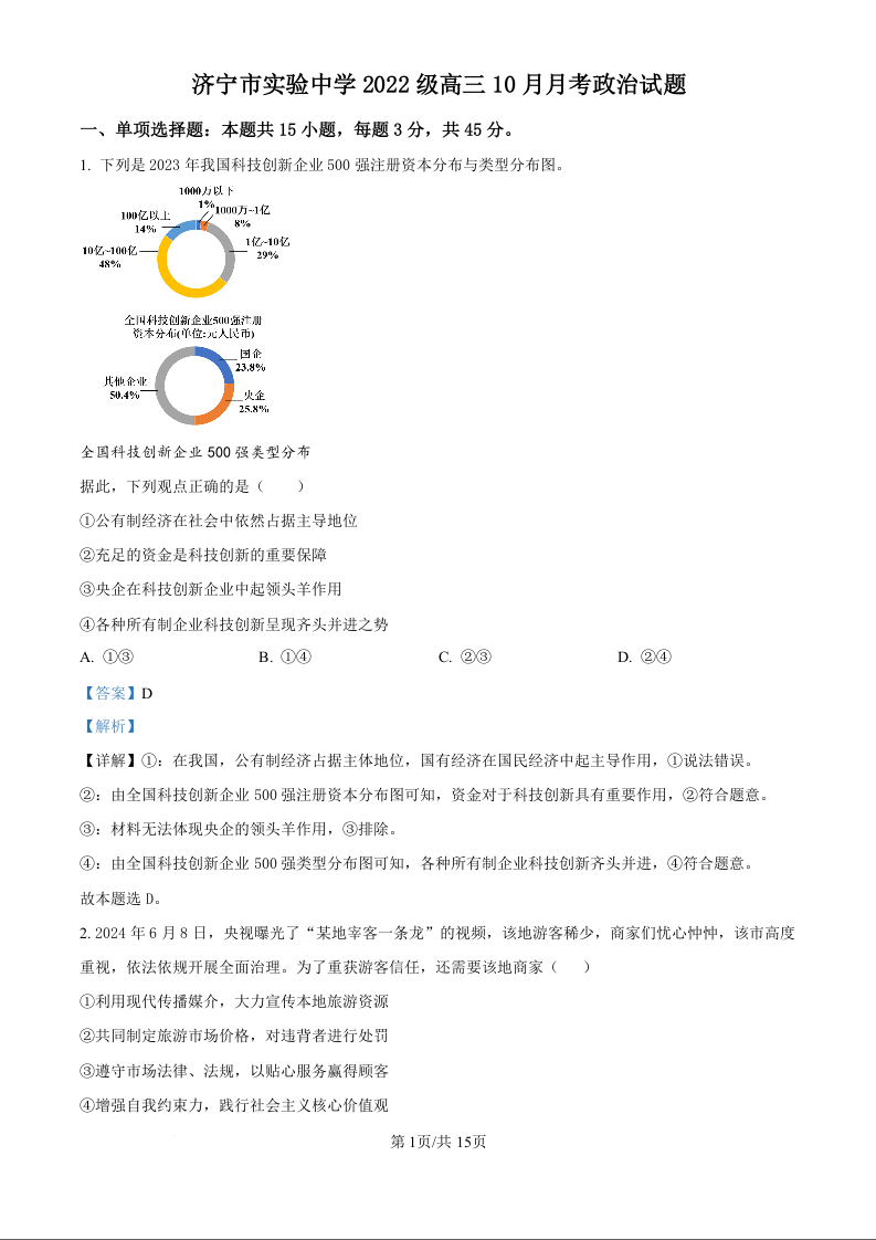 济宁市实验中学2022级高三10月月考 政治答案