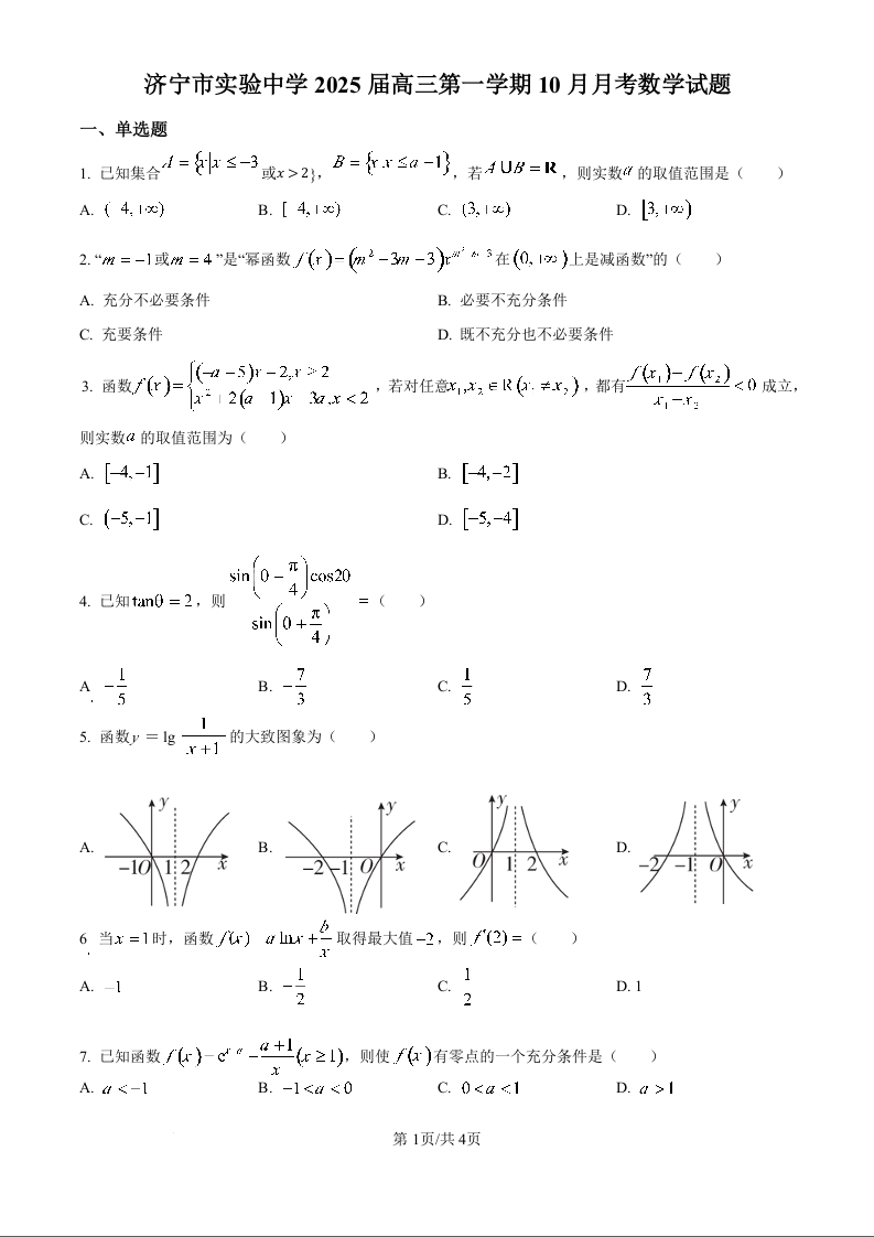 济宁市实验中学2022级高三10月月考 数学