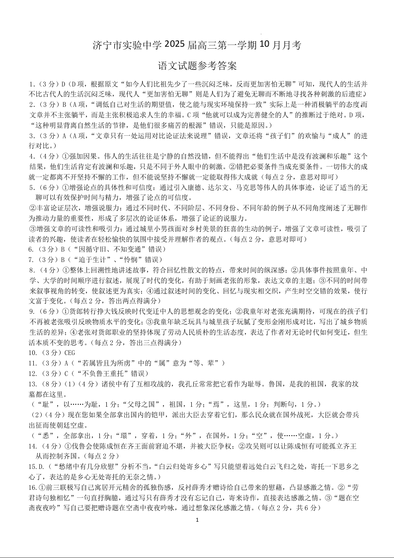 济宁市实验中学2022级高三10月月考 语文答案